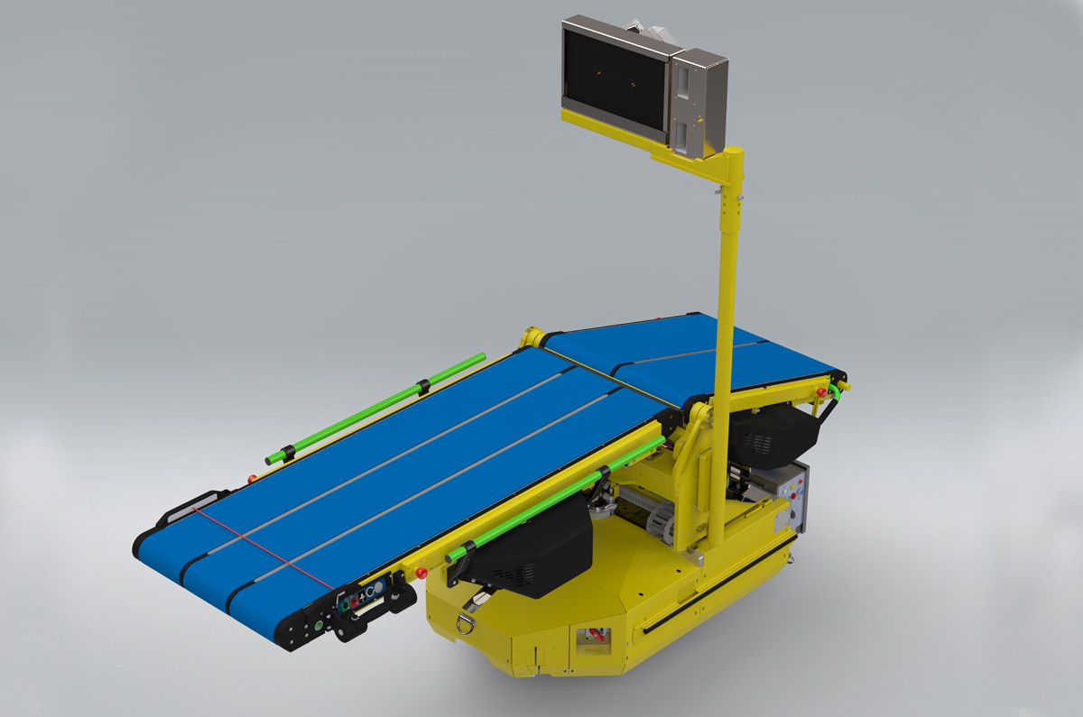 Operators can achieve greater throughput with less fatigue and muscle strain because of optimal positioning to the box wall. Workers stand on the operator platform and are able to access controls, drive and steer. With use of hydraulic power, an operator controls the vertical height of the platform (up to 26" from the floor) in order to safely be positioned to the product being unloaded. While standing on the platform, a worker grasps the rotary handle which allows the pivoting conveyor to be easily guided left and right. The pivoting conveyor can be positioned from 6” up to 5’8” from the floor. This maneuverability enables the operator to position the conveyor near the product, significantly reducing the risk of injury from repetitive lifting, twisting, carrying and overhead reaching.